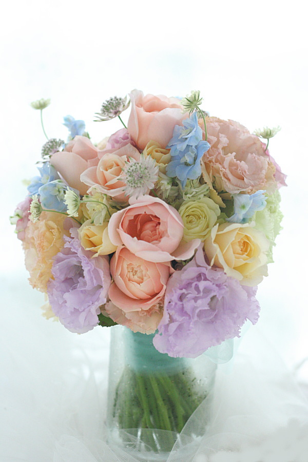 水色の、妖精さんみたいなドレスというものがこの世の中には確かにあってそれにおまかせであわせて作らせていただいたブーケです。