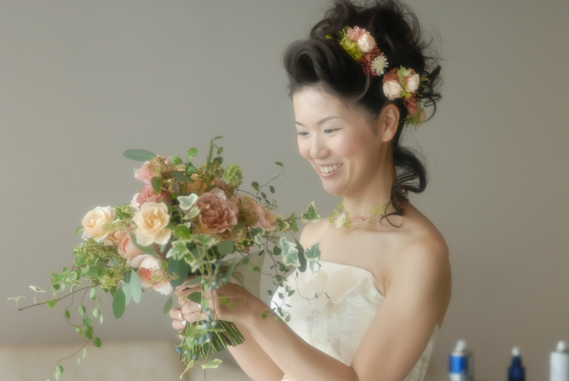 生花のブーケは夢にまでみた一会風。