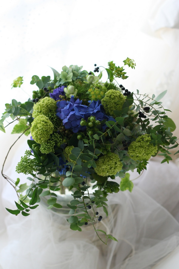 凛とした青をさし色にして作る、緑のクラッチブーケです。