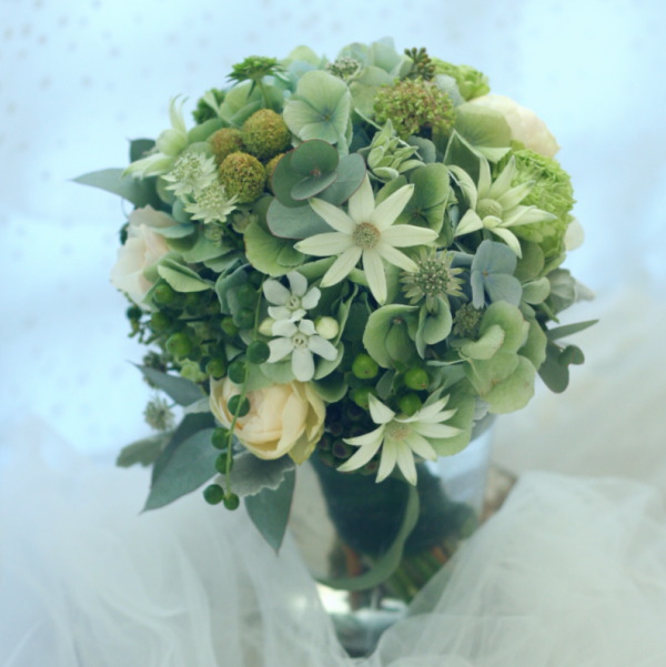 くすんだグリーンの葉の代表、ユーカリにあわせるフランネルフラワー。小さめクラッチブーケです。