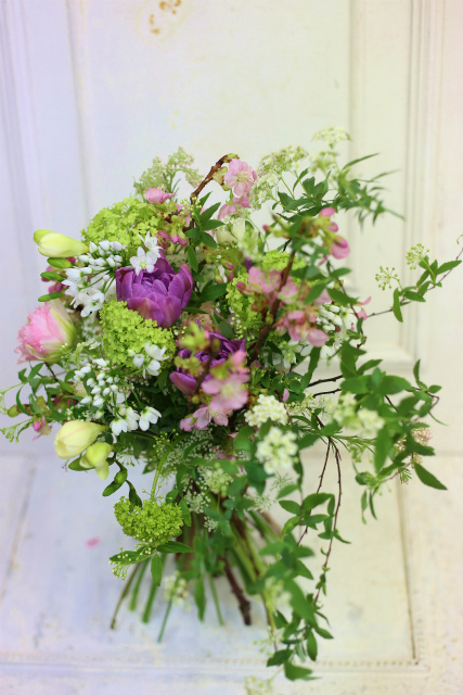 太い枝と折れやすい球根花とか華奢な草花の組み合わせ、