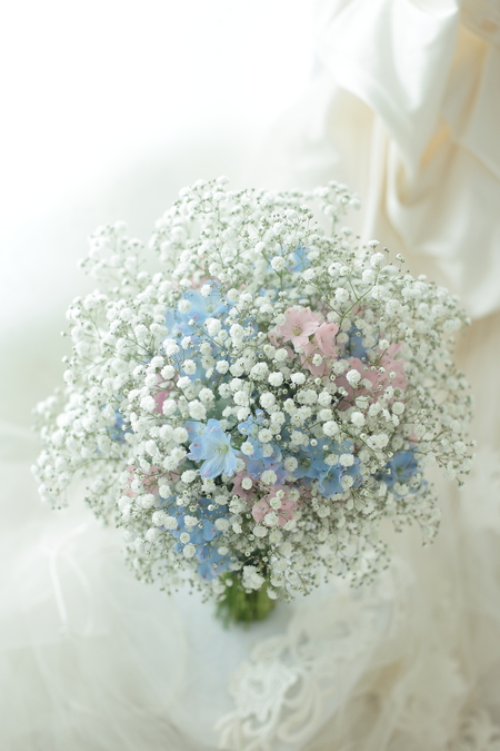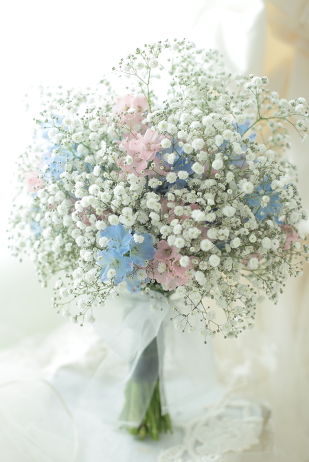 「カスミソウをメインに、淡い水色やピンクをいれて」