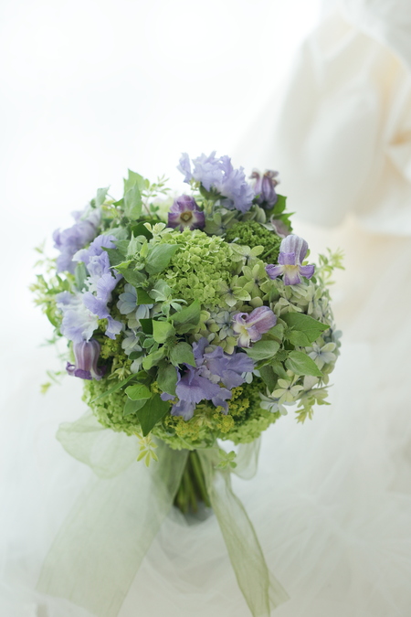 緑たくさんのクラッチブーケに、少し紫の挿し色をいれて