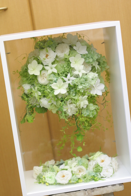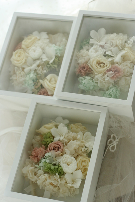 それぞれ足もとに花冠やブートニア等も一緒に入れています。