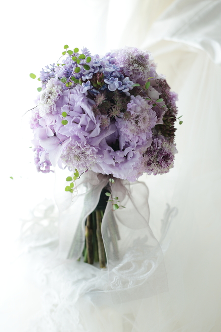 八重のトルコキキョウを束ねる淡紫のブーケです。