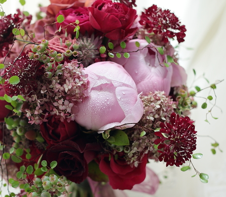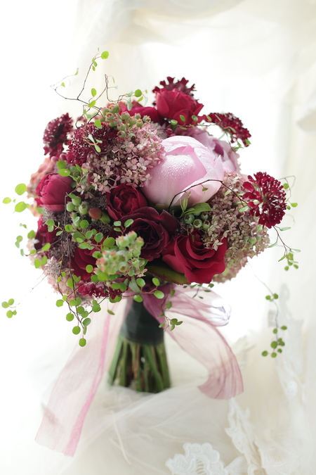 ピンクのシャクヤクと赤いバラをブーケに使って、