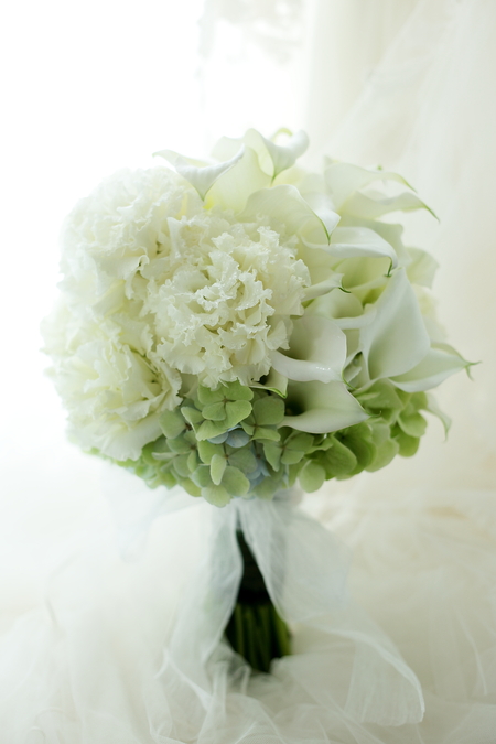 花はカラーとトルコキキョウの八重、そしてアジサイです。