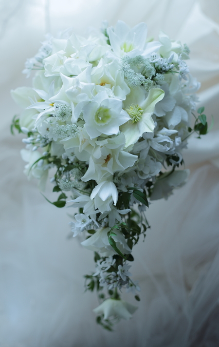 ユーチャリス、クリスマスローズ、そしてバラの「ウェディングドレス」。