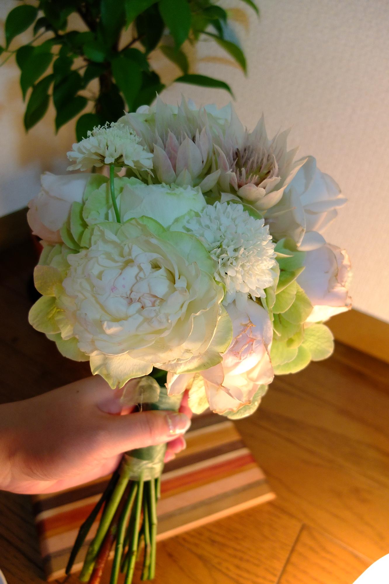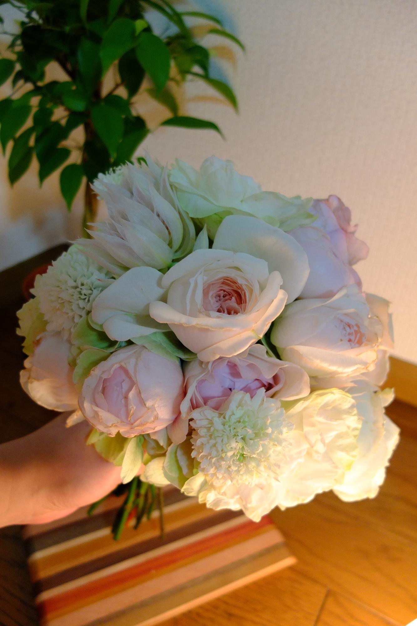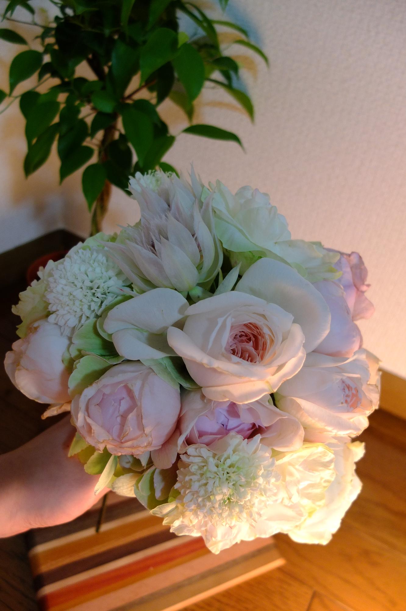 白っぽいブーケが届いて、
