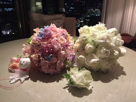 二つのクラッチブーケもブートニアも夜までちゃんと