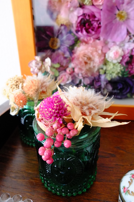 沢山ドライフラワーが出来たので、家中に飾ってます。