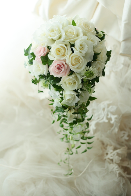 下に流れるキャスケードブーケ、白バラでクラシカルに。