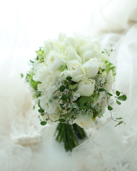 先日の高輪教会さまへのブーケ、白と緑で。