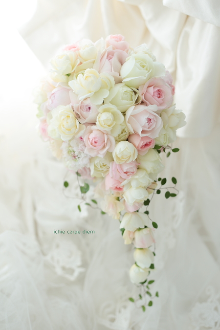本日帝国ホテルさまへ、バラいっぱいのキャスケードブーケ。