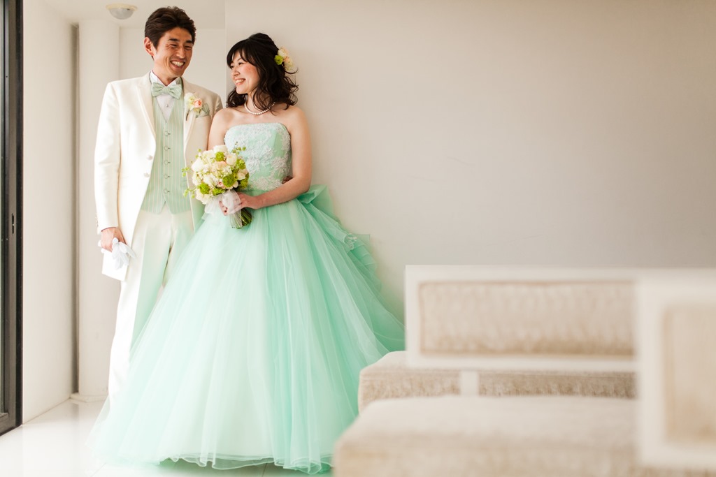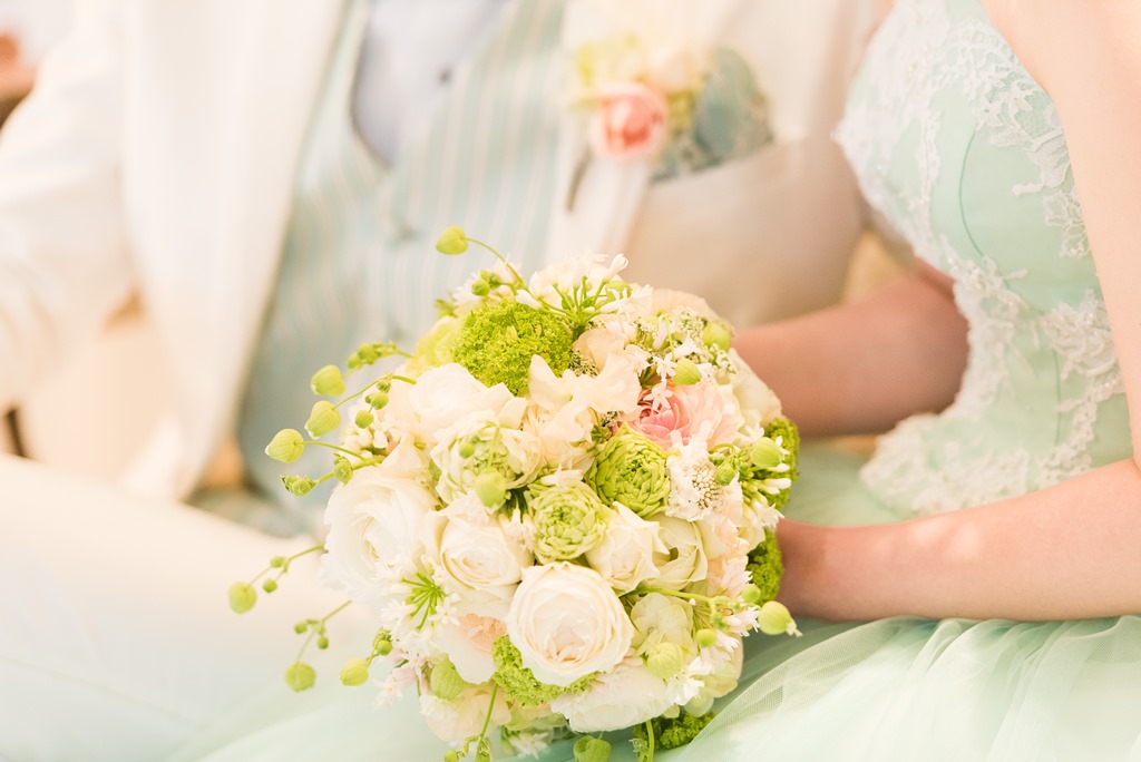 花嫁様からのお写真は、淡い緑のドレスもかわいく、