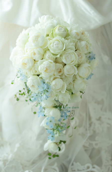 本日ザ・ペニンシュラ東京様へのブーケ、白に少し水色を添えて。