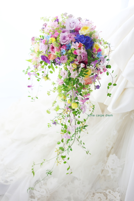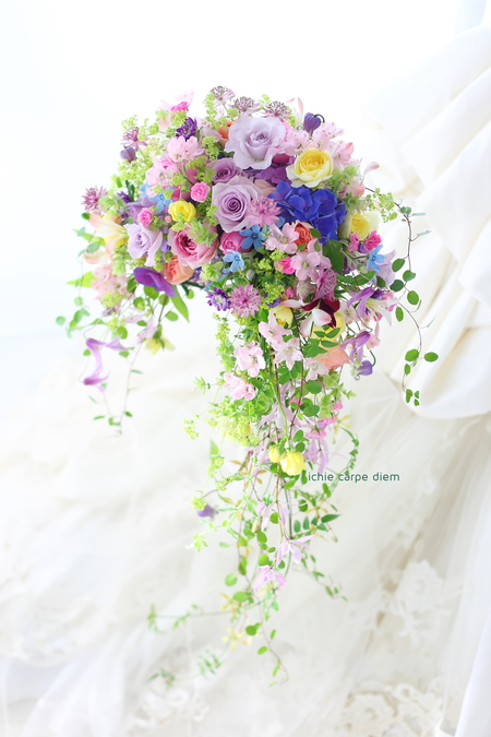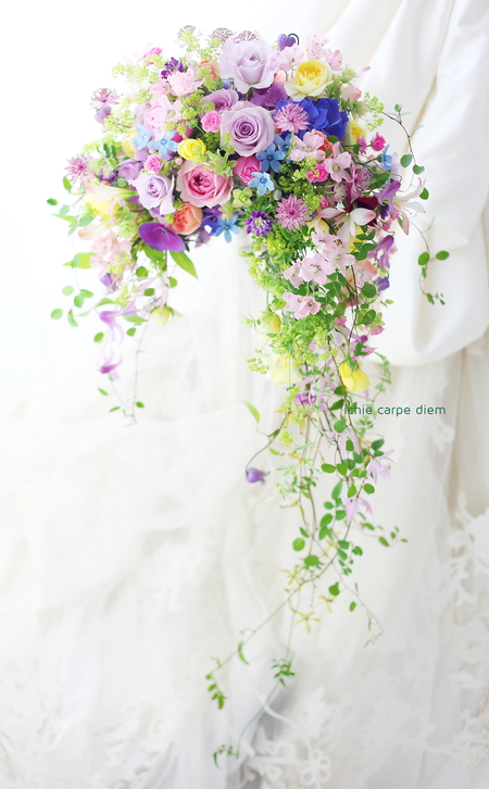 キャスケードブーケになるように、仕上げます。