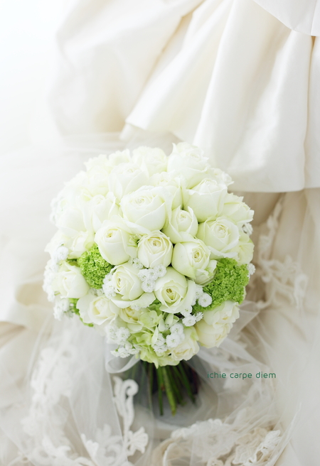 白バラをぎゅぎゅっと束ねて緑を添えたブーケは