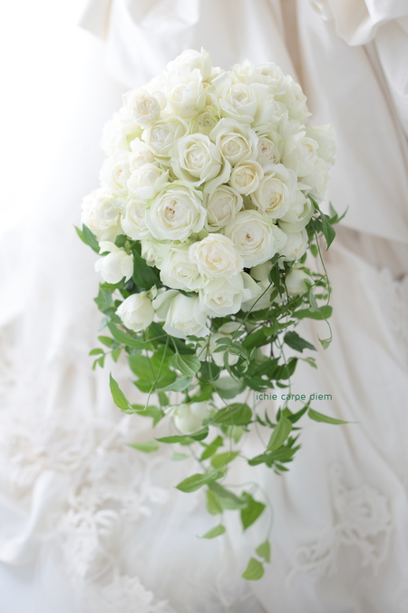 帝国ホテル様への、白のバラどっさりのブーケ。透明感のあるきれいな緑の葉は利休草、少し、羽衣ジャスミンも混ぜています。