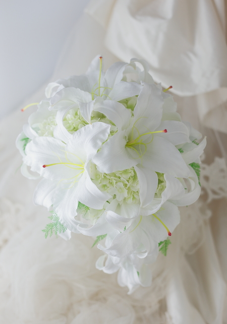 プリザーブドのユリは、生花にくらべて中心が純白で、