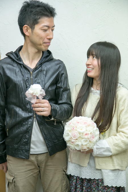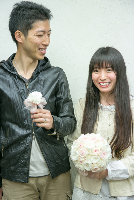 花婿さんが手作りしてくれたブーケを手に、花嫁さんにっこり。
