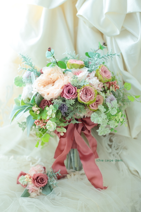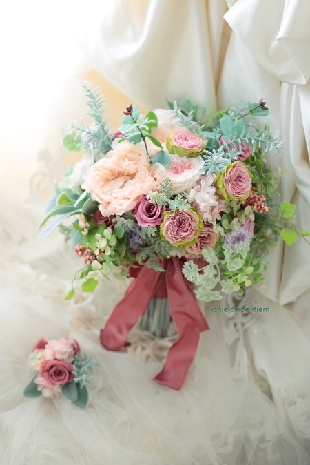 プリザーブドフラワーのブーケ、セピアピンクのドレスにあわせて、