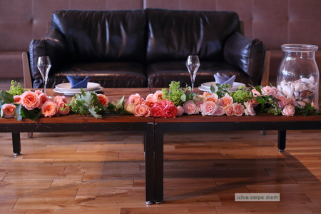 高砂はソファ席で、花をどさどさとカットして飾りました。