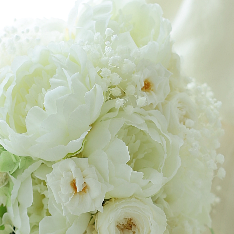 シャクヤクはアートフラワー、バラはプリザーブドフラワーです。