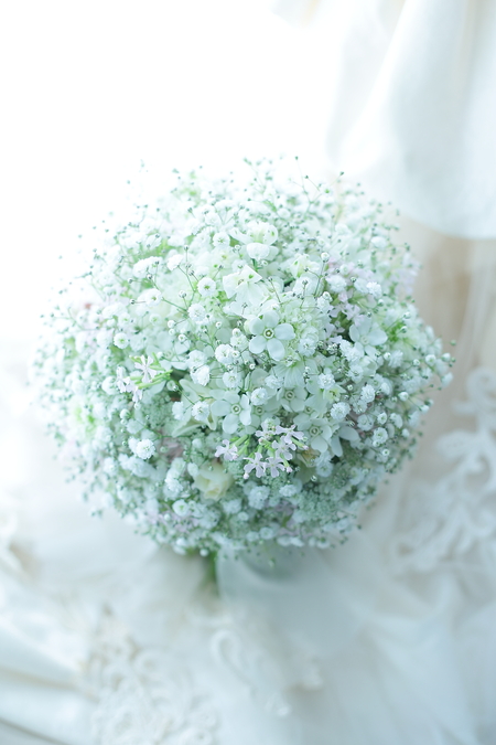 かすみそう、たくさんの中に、ホワイトスターのクラッチブーケ。