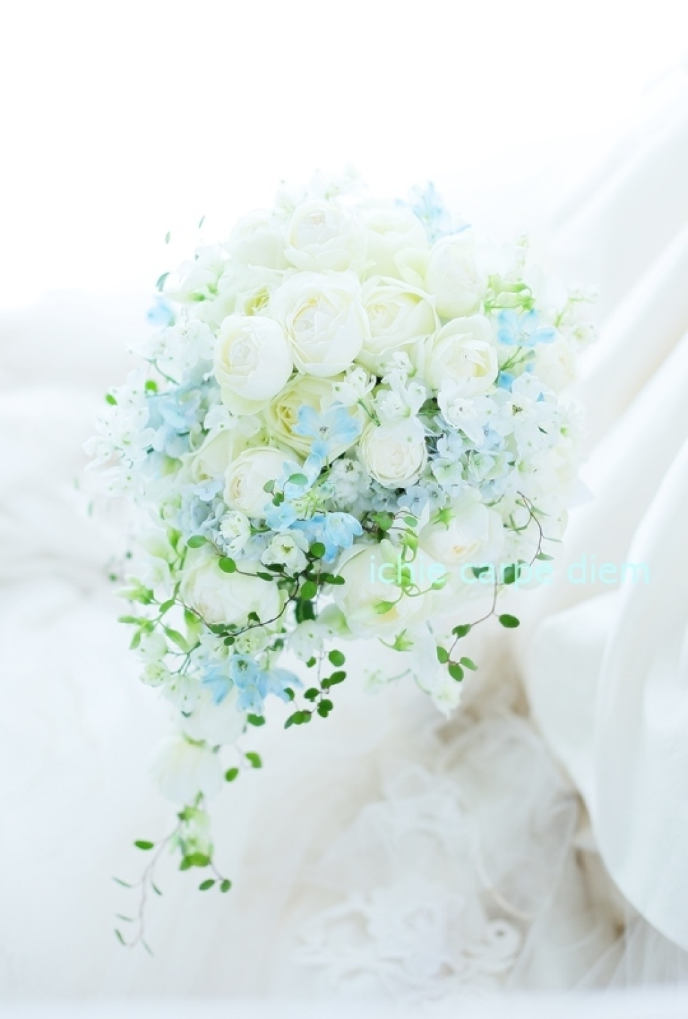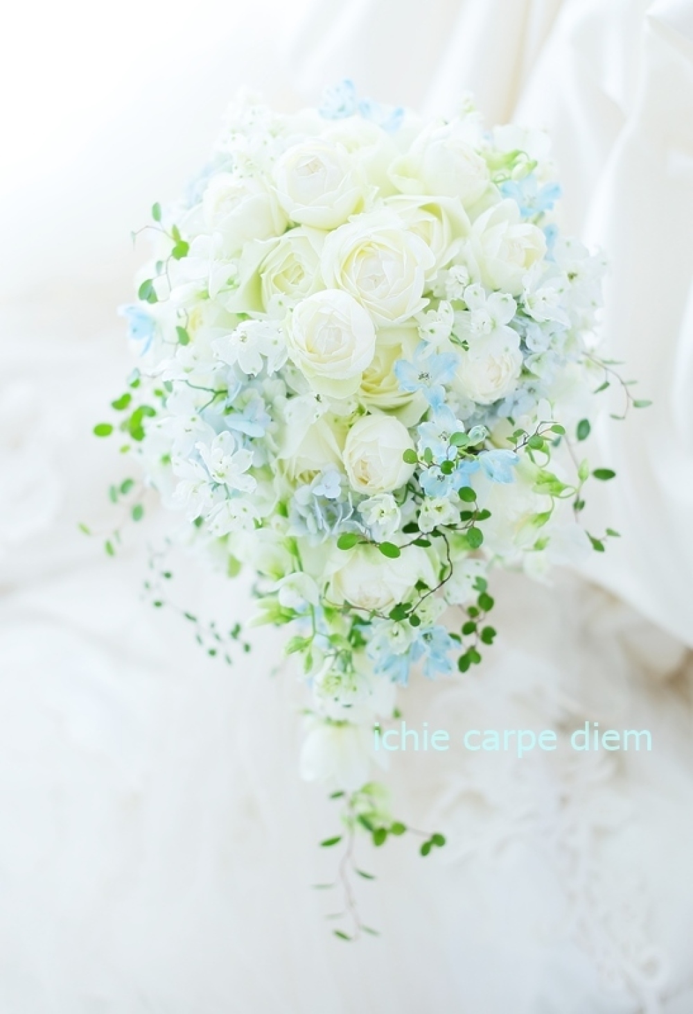5月のブーケ、八芳園さまへ、ふわりとしたセミキャスケードブーケ。