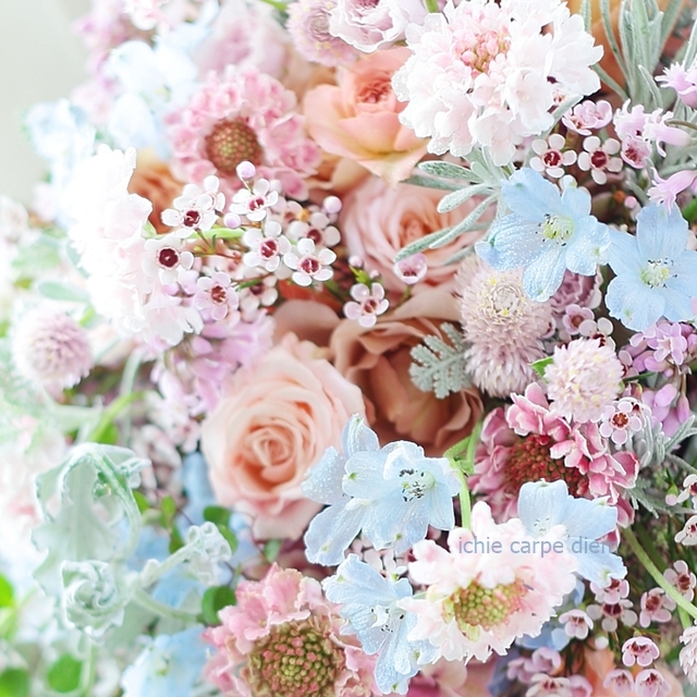 グレイッシュなくすんだピンクと、紅茶と、水色で。