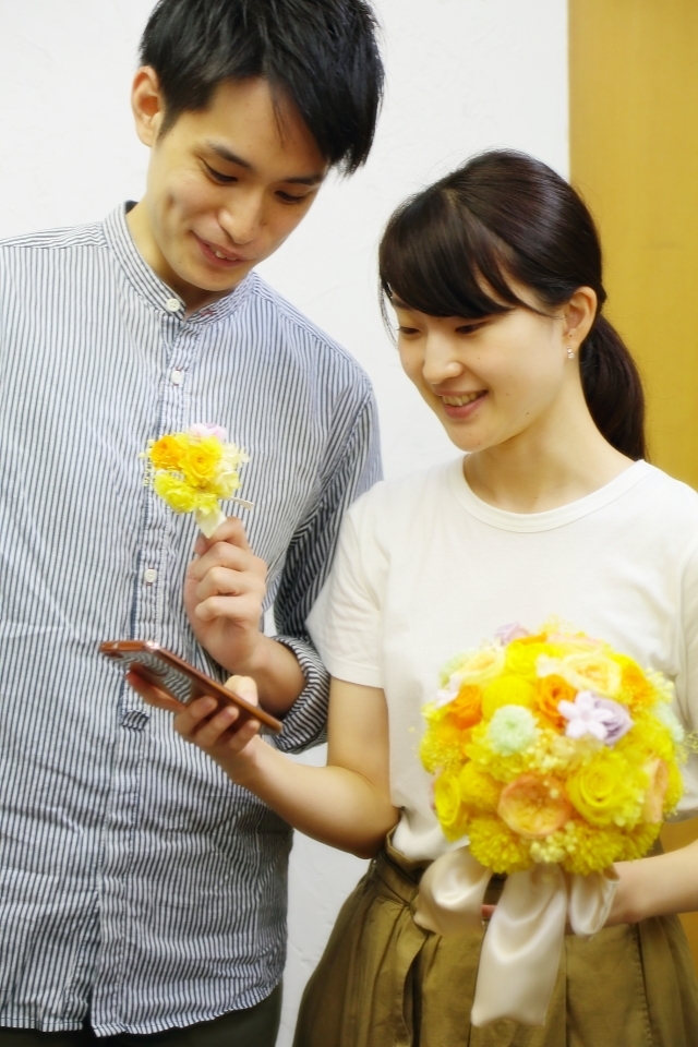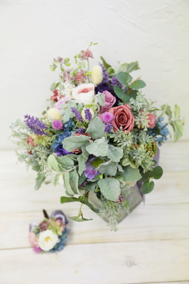 ブーケを花嫁様が、ブートニアを花婿様が手作り。