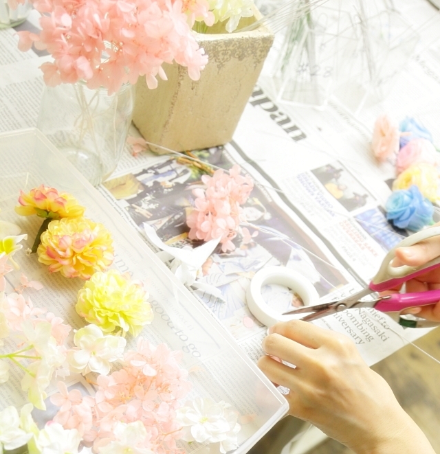 たくさんのお花にワイヤーをかけていって