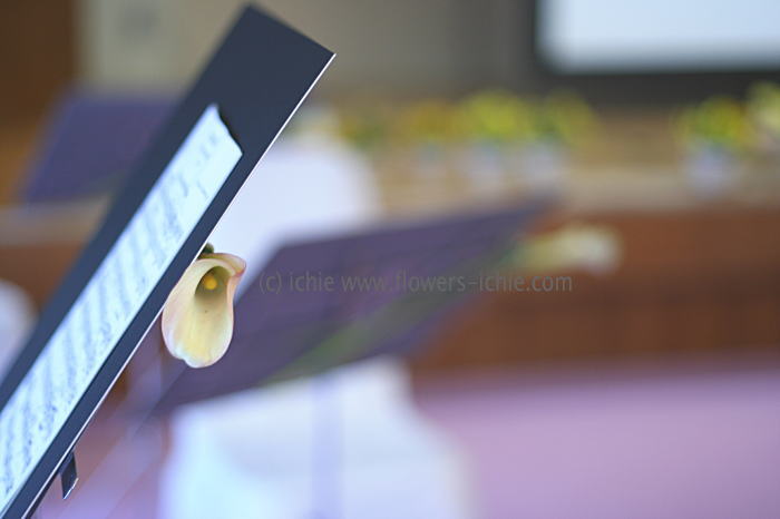 新婦さまからのお心遣いで、ひとつひとつの譜面台にあしらった