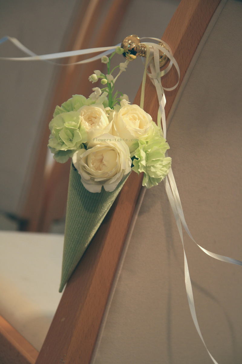 こちらはバージンロードの両脇の椅子に飾る、チェアフラワー。