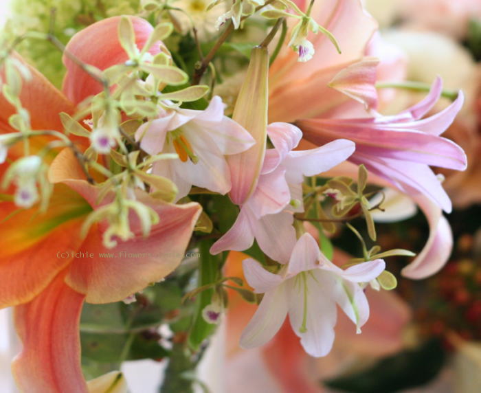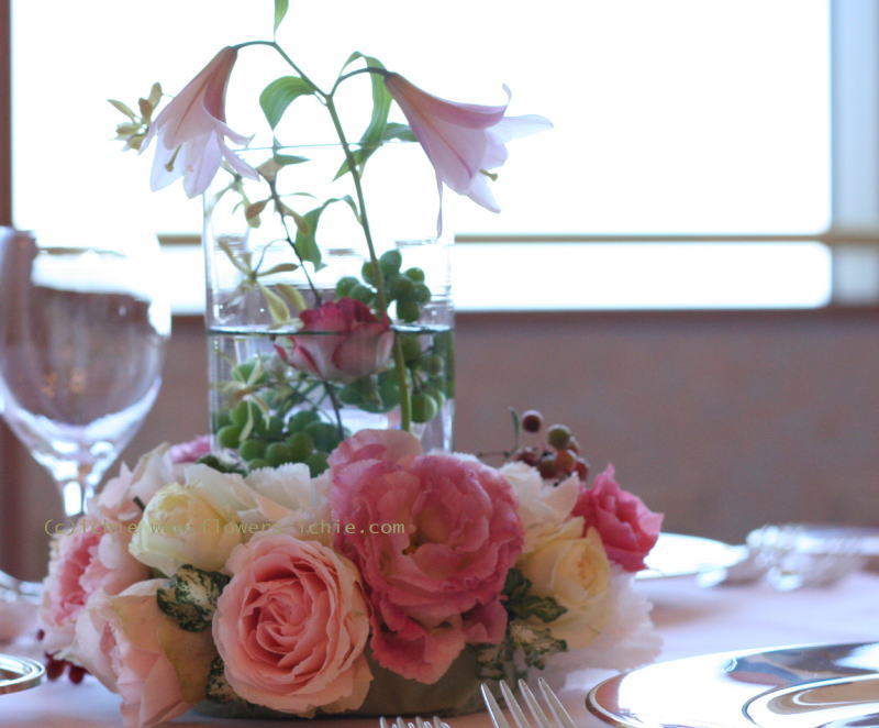 シェ松尾天王洲倶楽部様のメインテーブル装花です。この時期だけの乙女ユリという可憐なユリに、オレンジの不思議なユリ「グルーワイン」と、グリーンの不思議なラン「エンシクイア」と、一緒に水に活けて、6月の装花です。こちらは卓上装花。