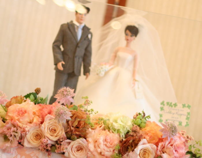 お知り合いにプレゼントされたというウェルカムドール@バービー人形、そのケースの前に飾った装花です。
