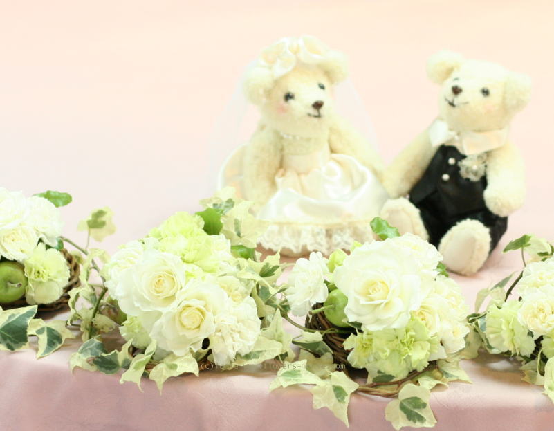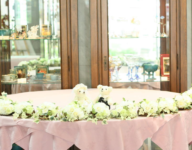 ウエルカムベアと一緒に、テーブルをふちどるように。