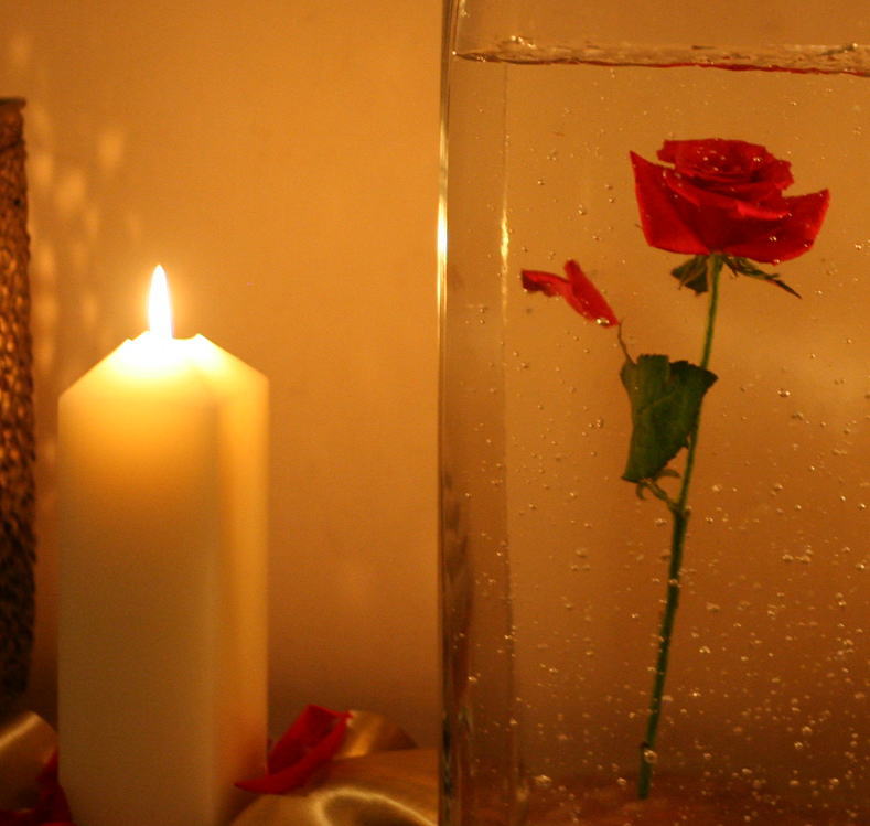 赤バラを水中に沈めて、ゆらりとはなれる花弁のひとつ。