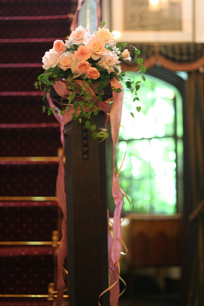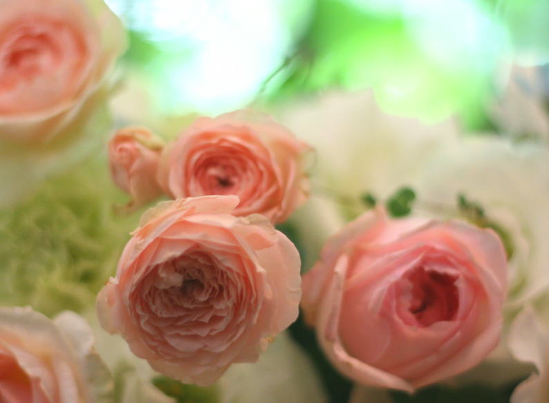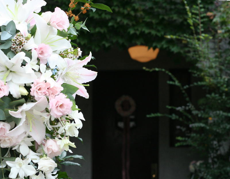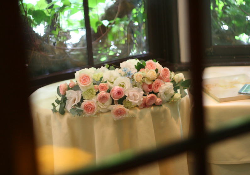 磨かれたガラス窓ごしに見えたケーキの装花。