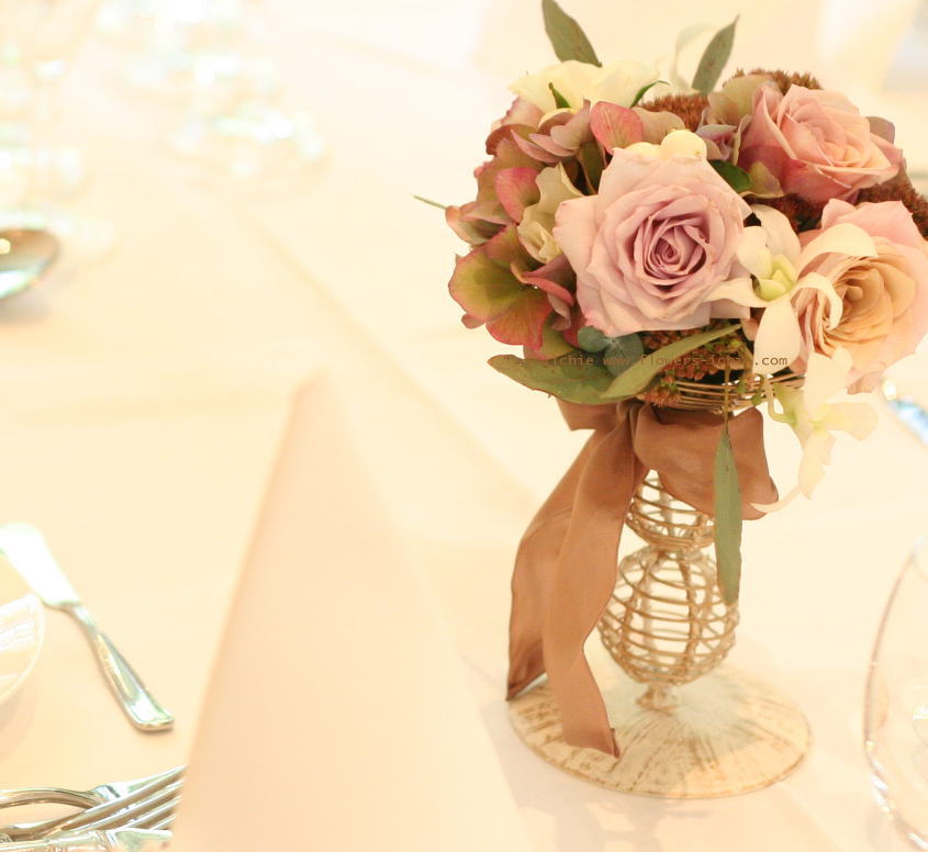 器に巻いたリボンは地味な色のようでいて艶も張りもある、実は高級お嬢様リボン。新婦様のリクエストで。