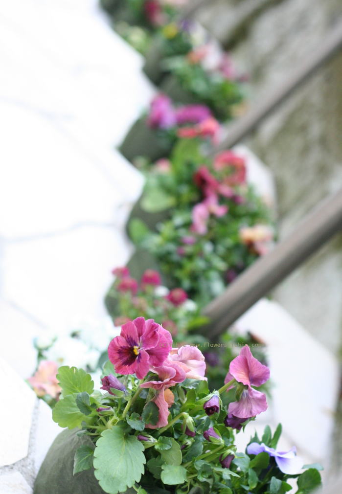 階段には、ニュアンスカラーのパンジーとアリッサムを