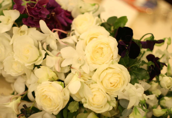 当日の装花ではパンジーに加えて、スイートピーも入っています。