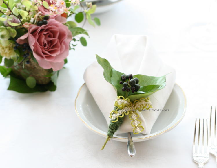 実ものにリボンをかけてナフキンフラワーをつけました。
