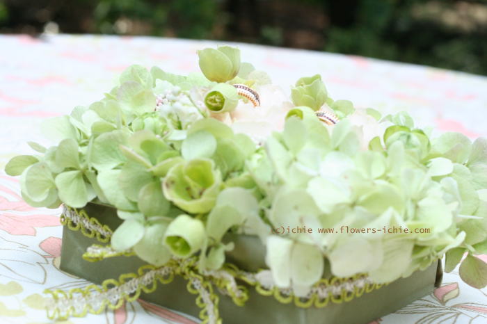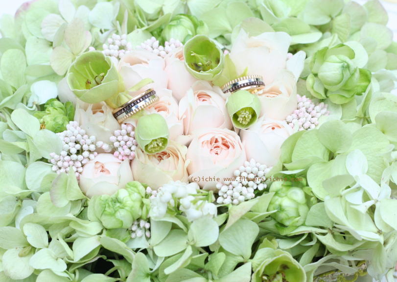 フェアビアンカという香りのよいバラを平らに並べた枕の上に、すずらんみたいなフェチダスというクリスマスローズの仲間をいれて、そのつぼみにひっかける形で作ったリングピロー。
