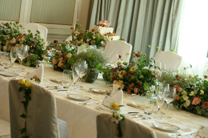 テーブル上をランナーのようにアレンジを置いています