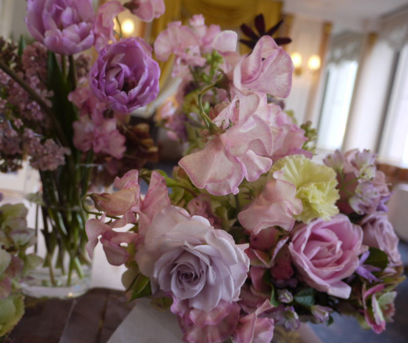 ひらひらした中央の花はスイートピーの「ボルドー」で、