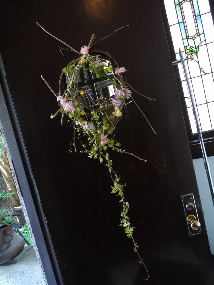 その窓にあうように枝を組んでリースをつくります。