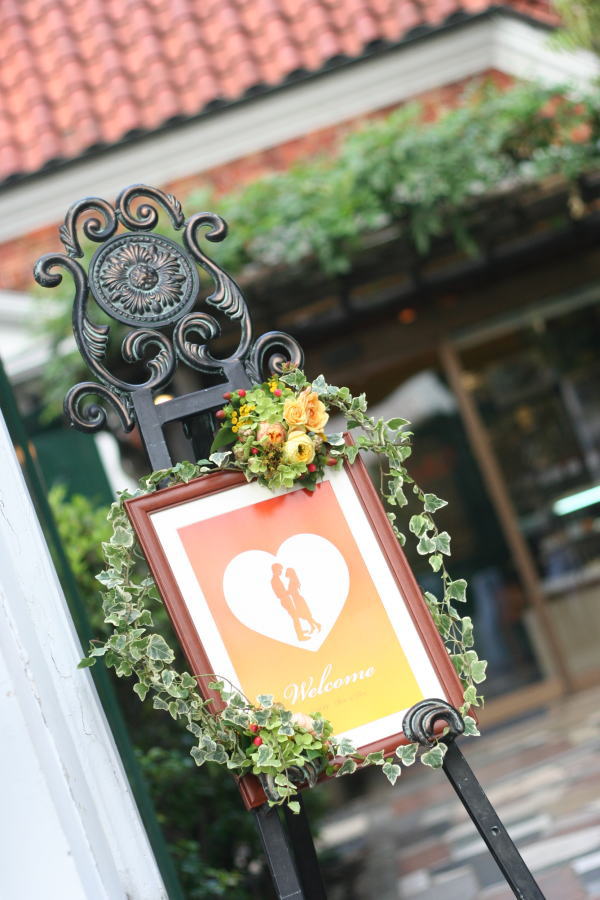 ウエルカムボードの装花は、ボードの絵柄を事前に送ってくださるとそれにあわせて花をつくっていきますが、当日、現場で余裕があればその柄にあわせて工夫することもできます。