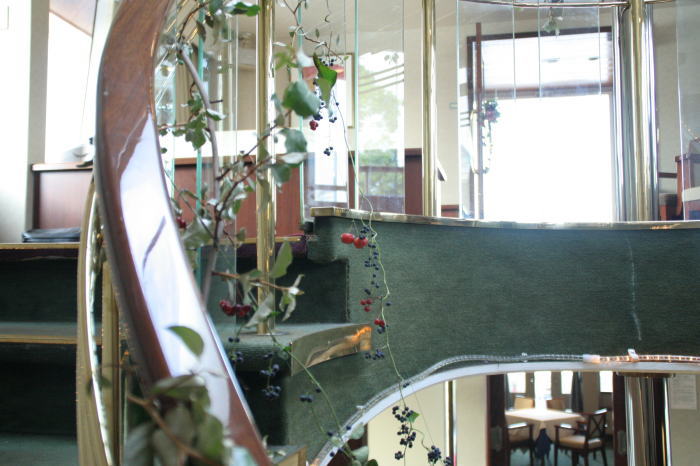 らせん階段に張り巡らせた、万国旗みたいに仕立てた実もの。実は、